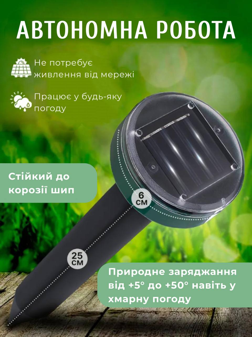 Легкий і компактний пристрій, потрібно лише встромити в землю на 20см та увімкнути